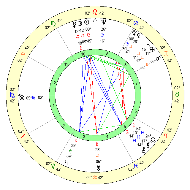 | Moon | 12 Leo 0 | 23 Scorpio 31 | 17 Virgo 49 |