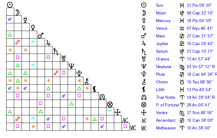 | Mercury | 18 Pisces 5 | 9 Aries 7 | 5 Gemini 55 |