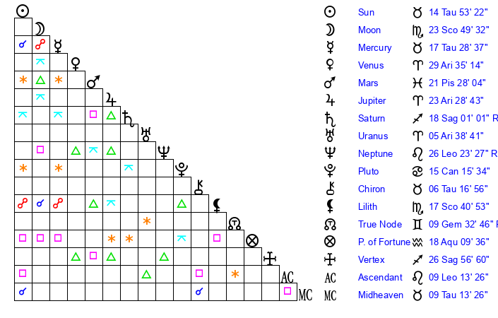 | Sun | 14 Taurus 53 | 15 Taurus 24 | 17 Leo 44 |
