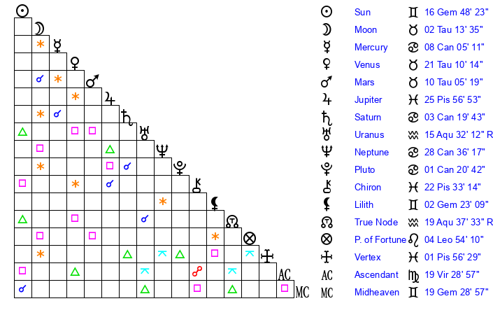 | Sun | 16 Gemini 48 | 18 Gemini 9 | 2 Libra 31 |