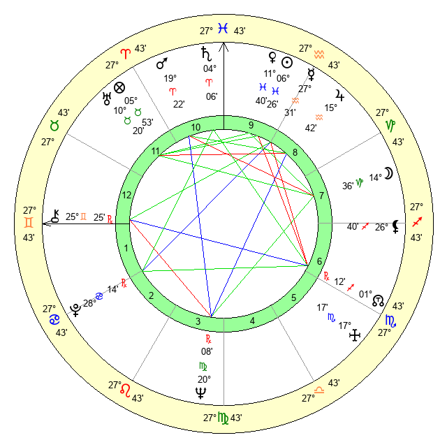 | Jupiter | 15 Aquarius 38 | 12 Gemini 1 | 0 Pisces 52 |