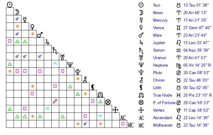 | Uranus | 20 Aries 41 | 26 Taurus 29 | 23 Aries 22 |