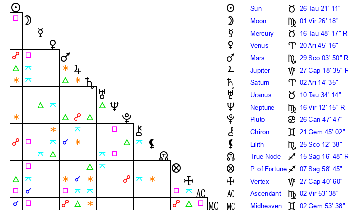 | Mercury | 16 Taurus 47 | 12 Taurus 58 | 17 Virgo 25 |