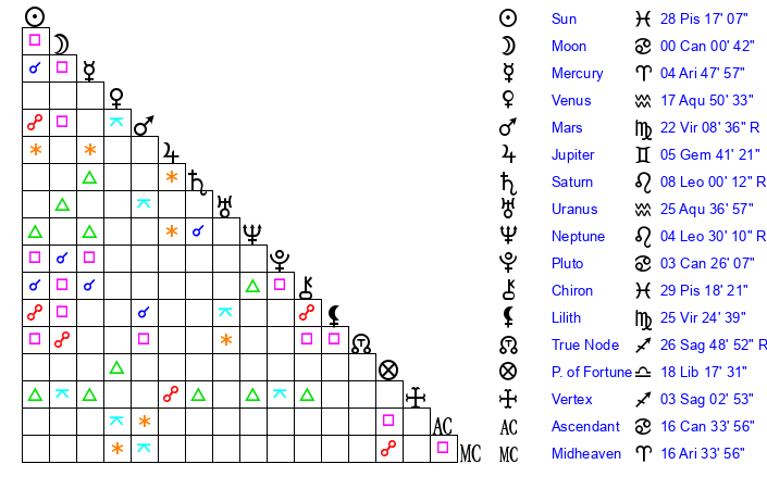 | Moon | 0 Cancer 3 | 28 Scorpio 12 | 25 Taurus 48 |