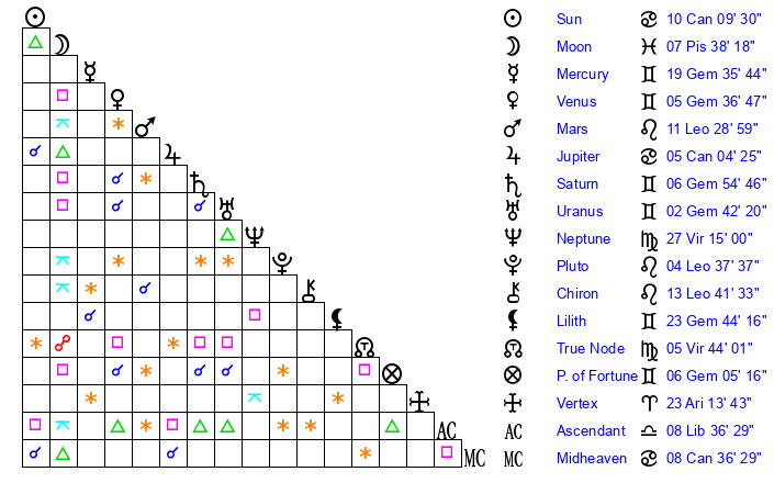 | Moon | 7 Pisces 39 | 9 Libra 59 | 18 Pisces 37 |