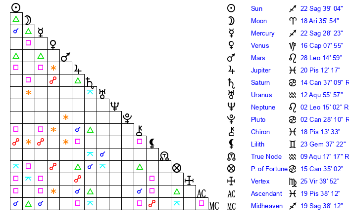 | Sun | 22 Sagittarius 39 | 24 Sagittarius 13 | 12 Aries 37 |