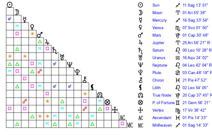 | Sun | 11 Sagittarius 13 | 12 Sagittarius 2 | 0 Aries 30 |