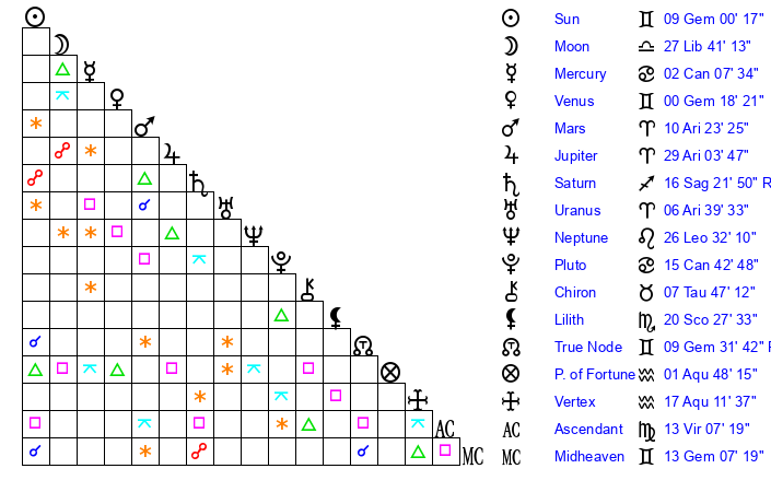 | Venus | 0 Gemini 19 | 23 Aries 42 | 29 Virgo 42 |