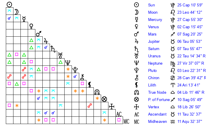 | Sun | 25 Capricorn 11 | 25 Capricorn 48 | 19 Aries 27 |