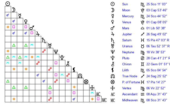 | Mercury | 24 Scorpio 45 | 1 Sagittarius 50 | 0 Aquarius 51 |