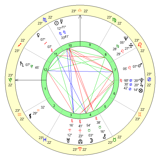 | Neptune | 5 Virgo 29 | 29 Pisces 41 | 4 Virgo 50 |