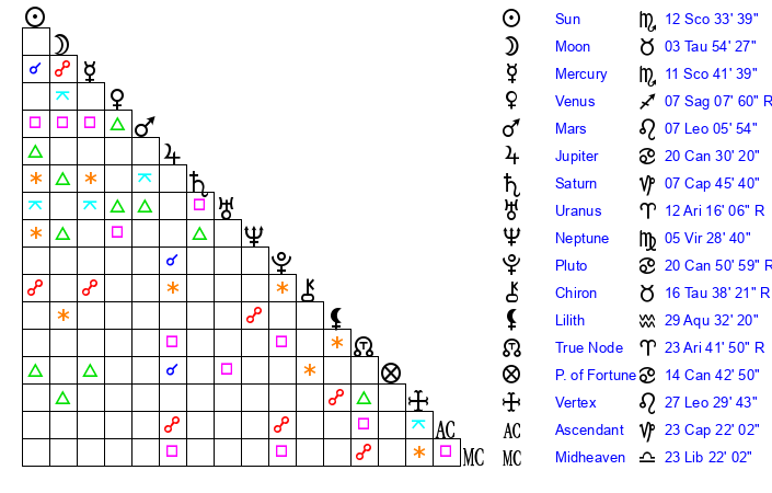 | Sun | 12 Scorpio 34 | 13 Scorpio 32 | 18 Aquarius 59 |