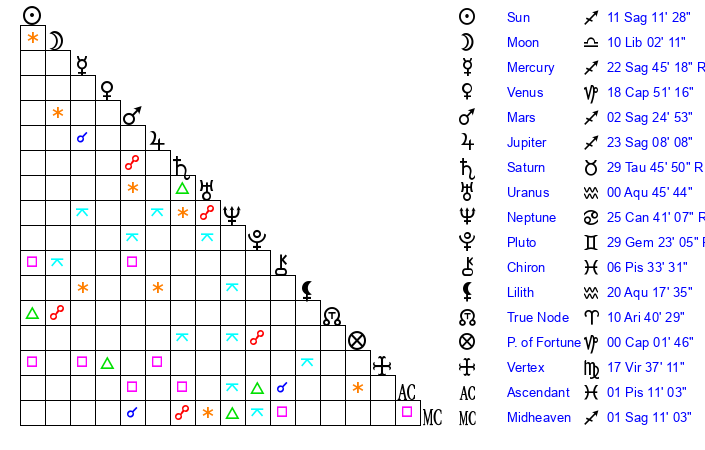 Mercury | 22 Sagittarius 45 | 17 Sagittarius 39 | 8 Aries 54 |