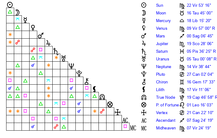 | Sun | 22 Virgo 53 | 24 Virgo 5 | 22 Sagittarius 48 |
