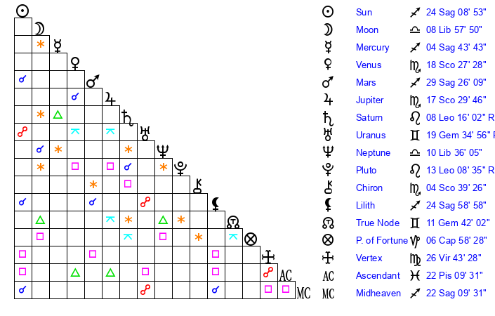 | Sun | 24 Sagittarius 9 | 25 Sagittarius 14 | 13 Pisces 17 |