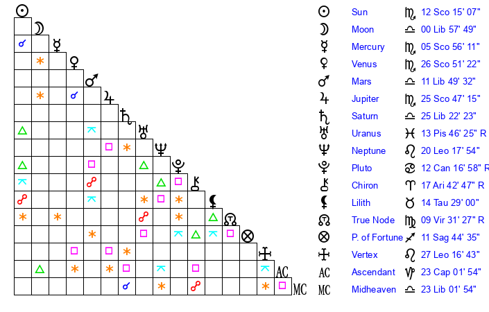 | Sun | 12 Scorpio 15 | 13 Scorpio 32 | 25 Aquarius 45 |
