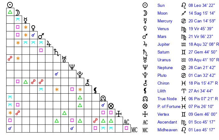 | Venus | 19 Virgo 45 | 1 Cancer 47 | 8 Sagittarius 40 |