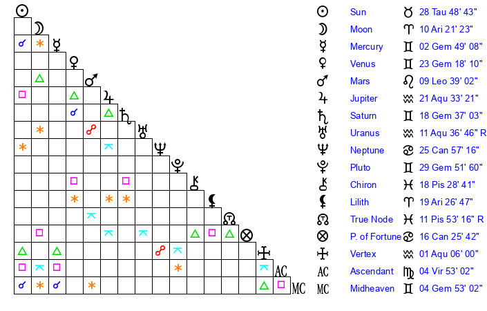 | Jupiter | 21 Aquarius 16 | 25 Gemini 30 | 13 Aquarius 36 |