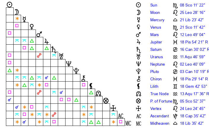 | Neptune | 2 Leo 40 | 29 Pisces 46 | 0 Leo 32 |