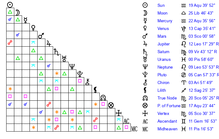 | Sun | 19 Aquarius 40 | 21 Aquarius 12 | 3 Gemini 11 |