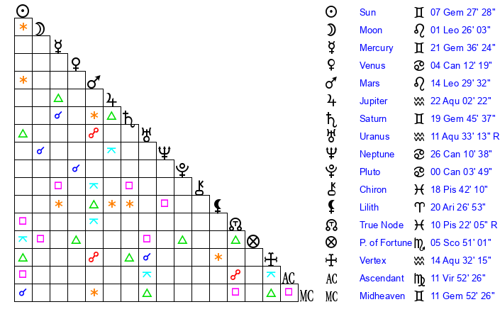 | Jupiter | 21 Aquarius 44 | 27 Gemini 29 | 12 Aquarius 53 |