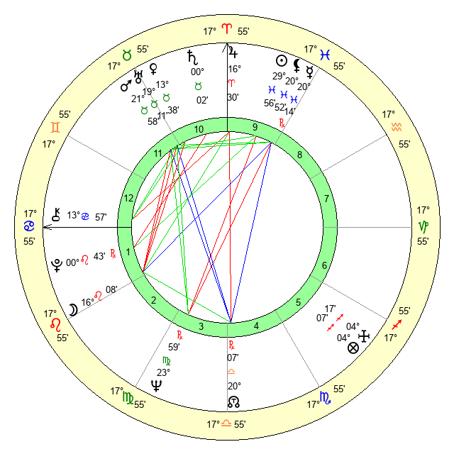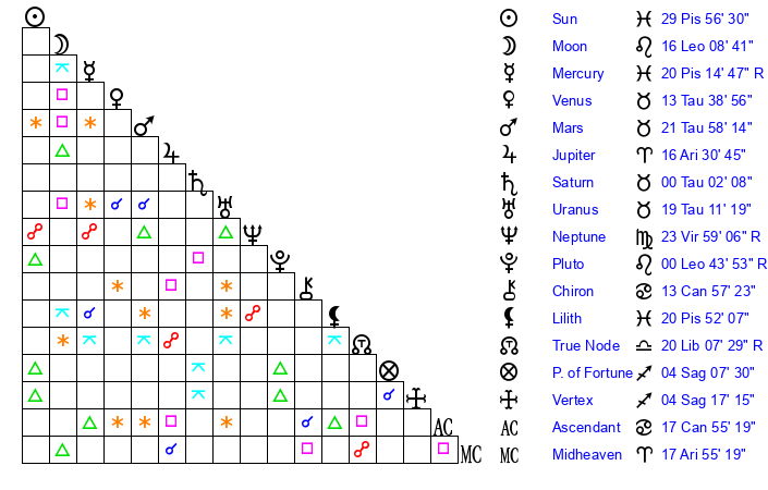| Sun | 29 Pisces 56 | 0 Aries 20 | 22 Gemini 30 |