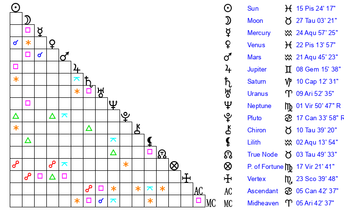 | Venus | 22 Pisces 14 | 10 Aries 23 | 18 Cancer 41 |