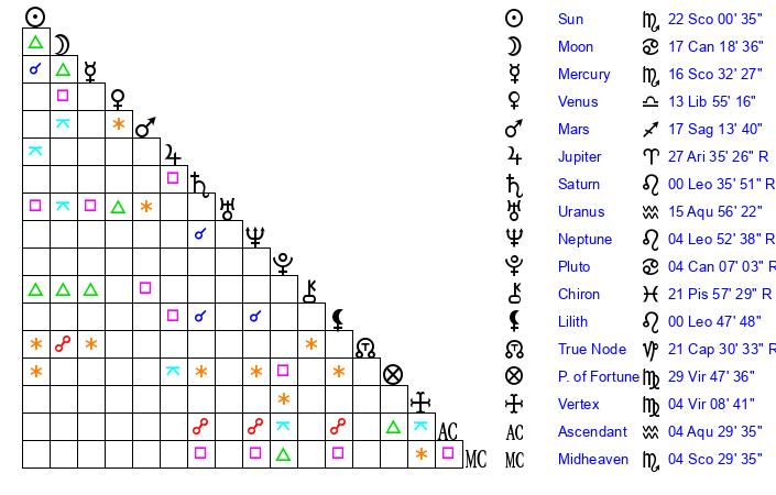 | Neptune | 4 Leo 53 | 27 Pisces 16 | 2 Leo 32 |
