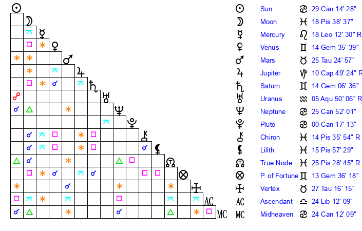 | Mercury | 18 Leo 12 | 14 Leo 45 | 8 Sagittarius 45 |