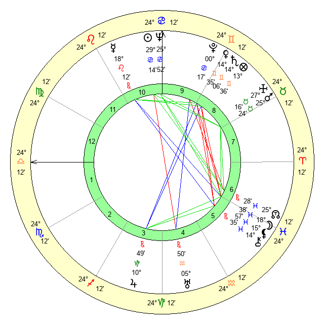 | Sun | 29 Cancer 14 | 0 Leo 8 | 18 Scorpio 43 |
