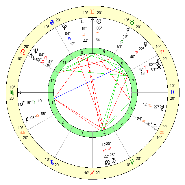 | Sun | 5 Gemini 34 | 6 Gemini 39 | 18 Virgo 7 |
