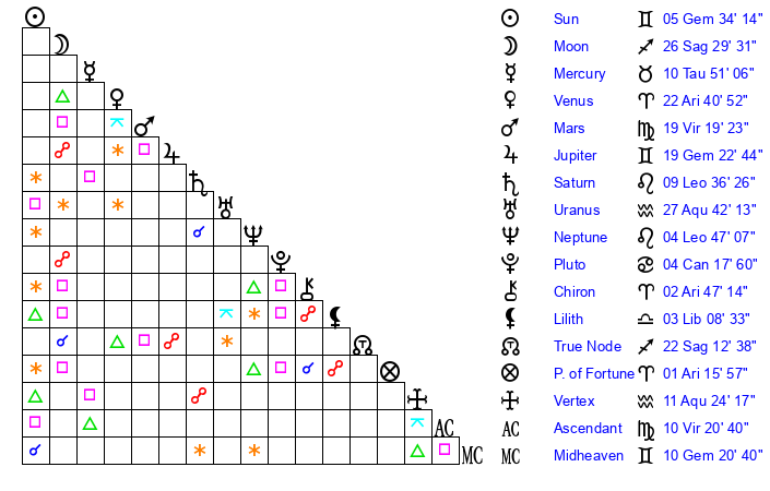 | Moon | 26 Sagittarius 37 | 14 Gemini 53 | 26 Scorpio 36 |