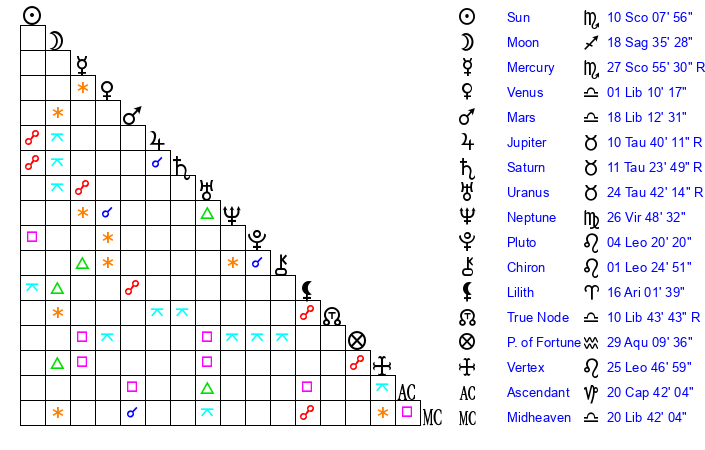 | Mercury | 27 Scorpio 55 | 3 Sagittarius 49 | 16 Aquarius 46 |