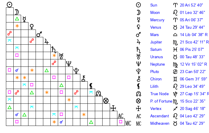 | Sun | 20 Aries 52 | 22 Aries 3 | 17 Cancer 29 |