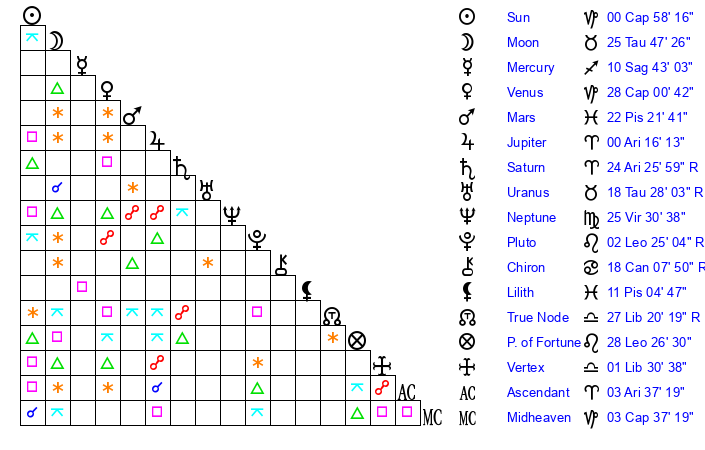 | Sun | 0 Capricorn 58 | 2 Capricorn 7 | 27 Pisces 57 |