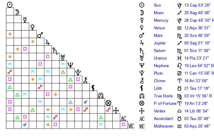 | Sun | 13 Capricorn 53 | 15 Capricorn 24 | 25 Aries 14 |