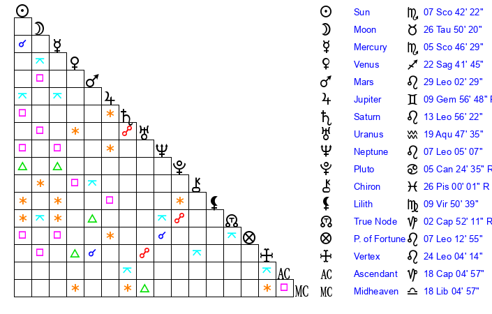 | Neptune | 7 Leo 5 | 29 Pisces 47 | 5 Leo 8 |