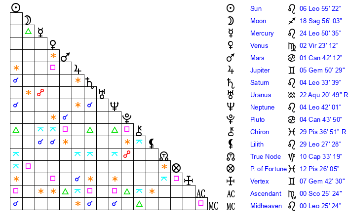 | Neptune | 4 Leo 42 | 1 Aries 59 | 7 Leo 6 |