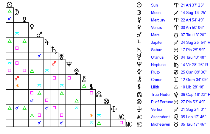 | Sun | 21 Aries 37 | 22 Aries 3 | 17 Cancer 16 |