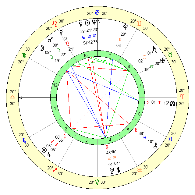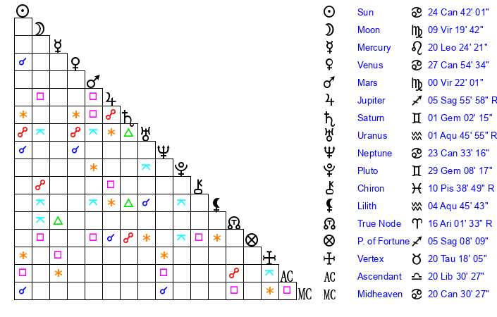 Sun | 24 Cancer 42 | 25 Cancer 22 | 14 Scorpio 56 |