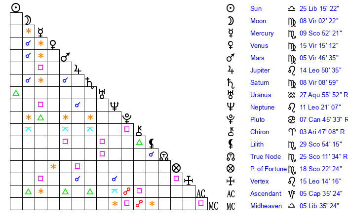 | Mars | 5 Virgo 46 | 18 Scorpio 47 | 0 Scorpio 38 |