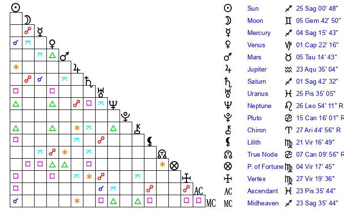| Sun | 25 Sagittarius 1 | 26 Sagittarius 15 | 4 Aries 3 |