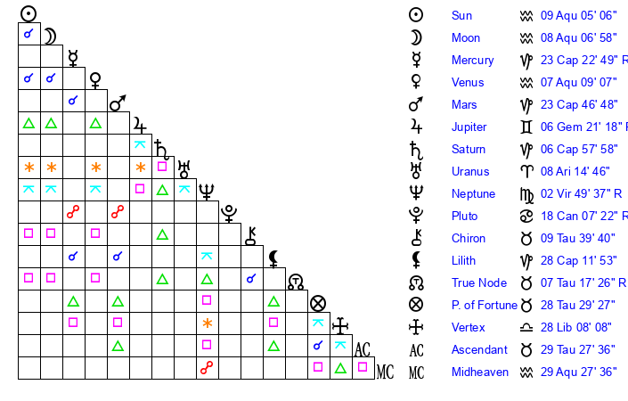 | Moon | 8 Aquarius 6 | 12 Aquarius 20 | 0 Leo 22 |