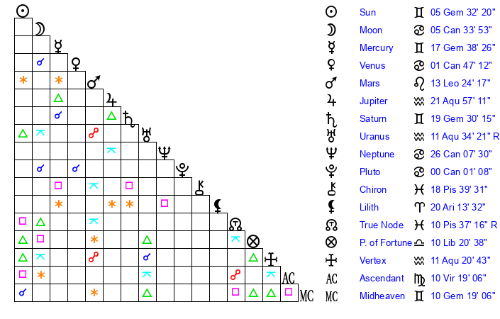 | Moon | 5 Cancer 42 | 14 Gemini 53 | 26 Cancer 46 |