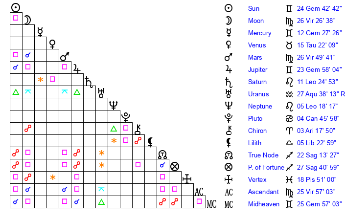 | Sun | 24 Gemini 42 | 25 Gemini 48 | 7 Libra 41 |