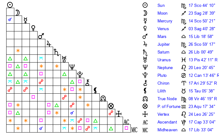 | Sun | 17 Scorpio 44 | 19 Scorpio 1 | 1 Pisces 16 |