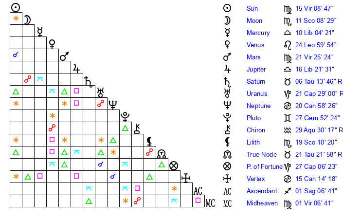 | Sun | 15 Virgo 9 | 16 Virgo 18 | 10 Capricorn 11 |