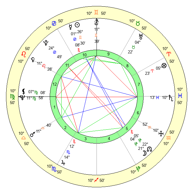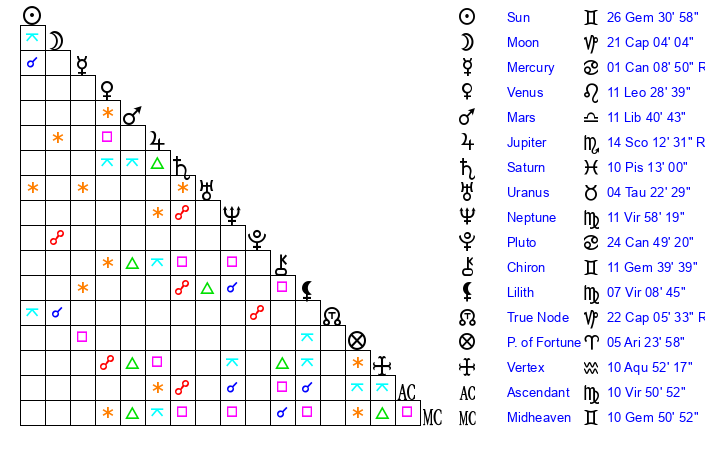 | Sun | 26 Gemini 31 | 27 Gemini 42 | 22 Virgo 53 |