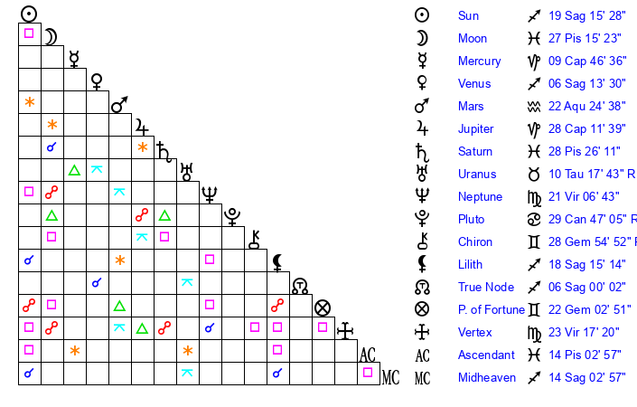 | Moon | 27 Pisces 17 | 18 Virgo 1 | 23 Gemini 12 |