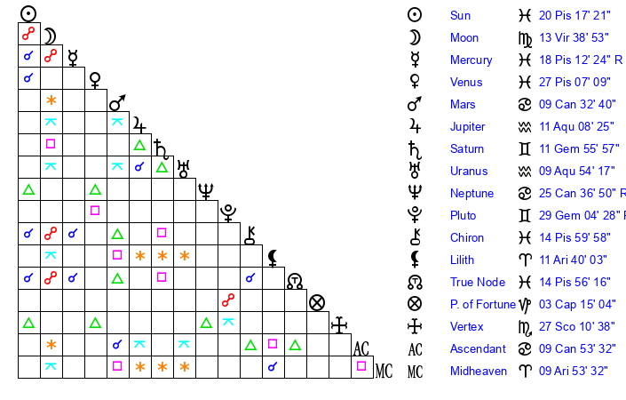 | Sun | 20 Pisces 17 | 21 Pisces 22 | 8 Cancer 2 |